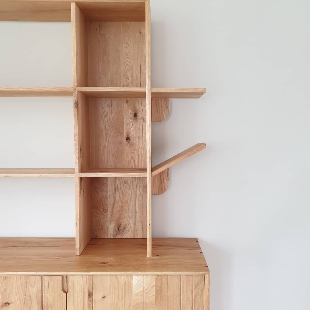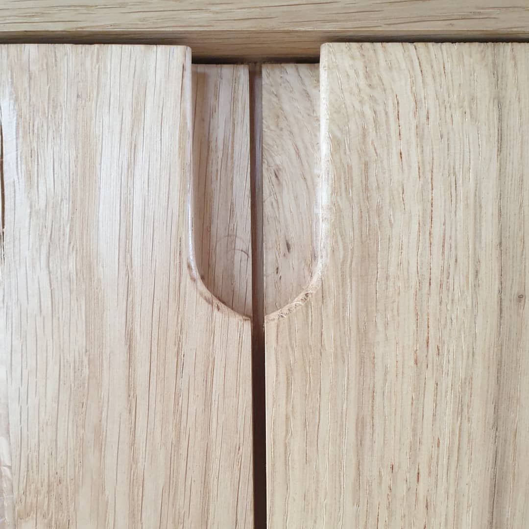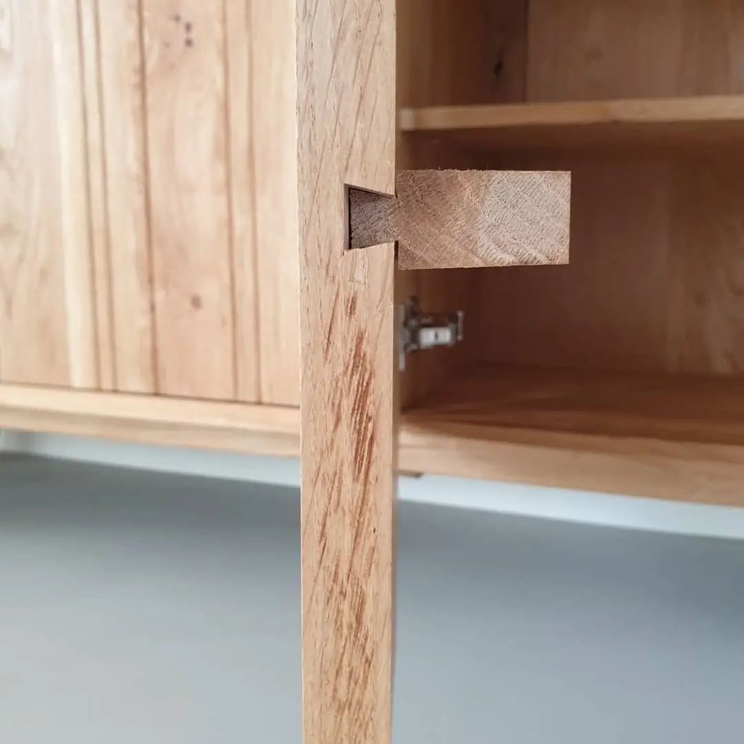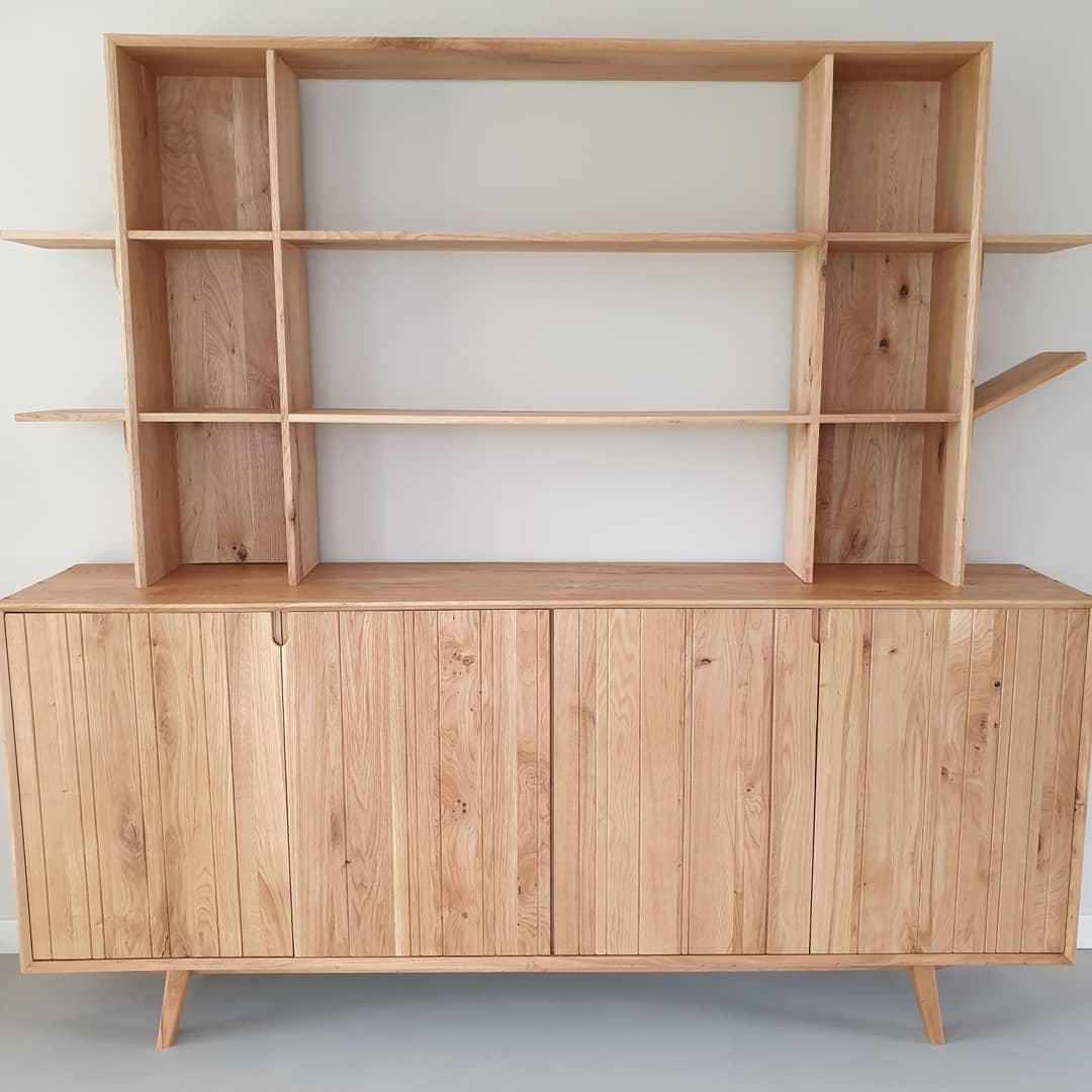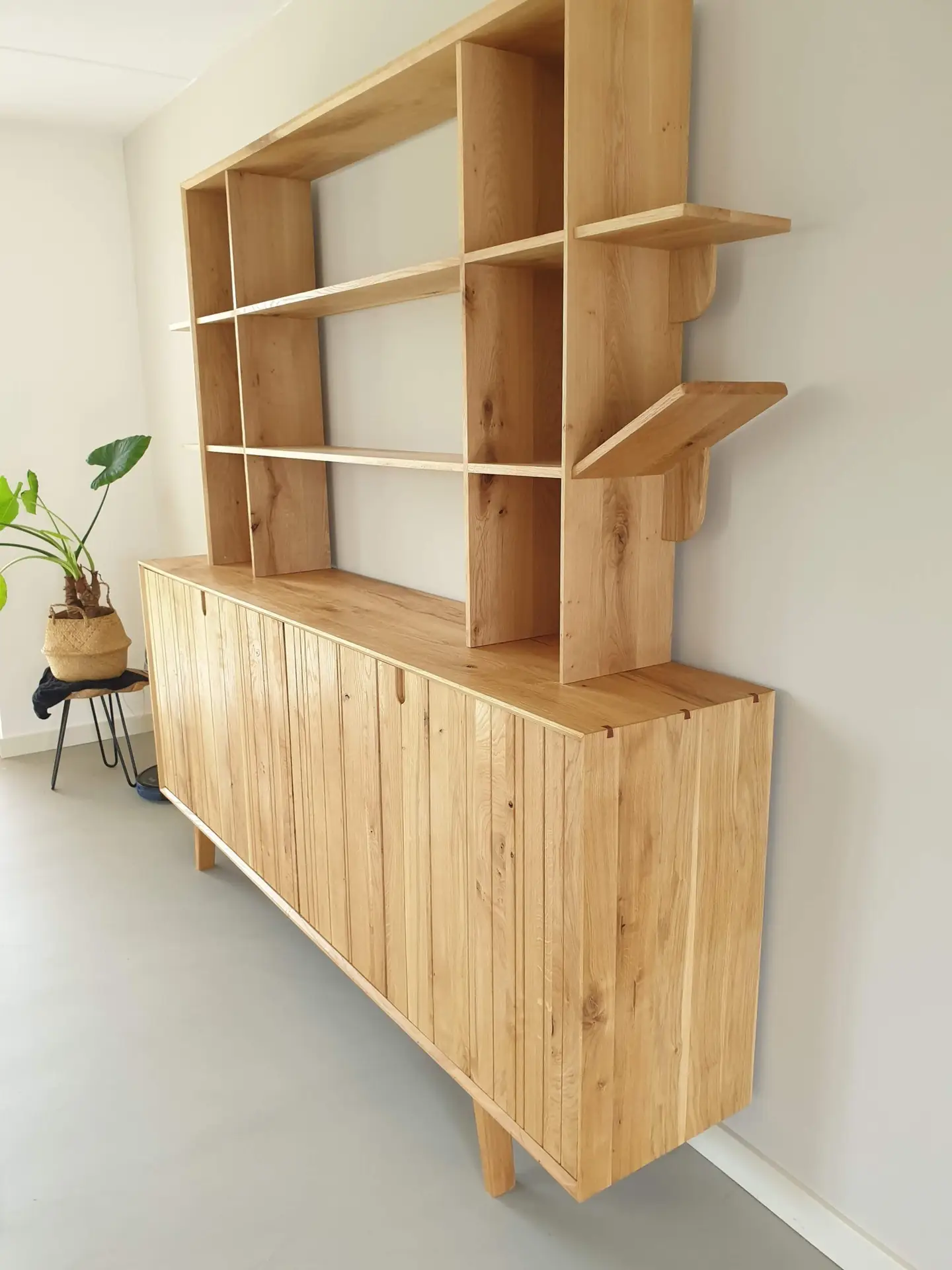 Dit geweldige project is volledig gemaakt in massief eiken. De kast is 2,3m breed en is uitgevoerd als 'dressoirkast' met een vakkenkast er boven op. De kast is gemaakt met enkele mooie details op de hoeken. De vingergrepen voor de deuren zijn uitgefreesd.