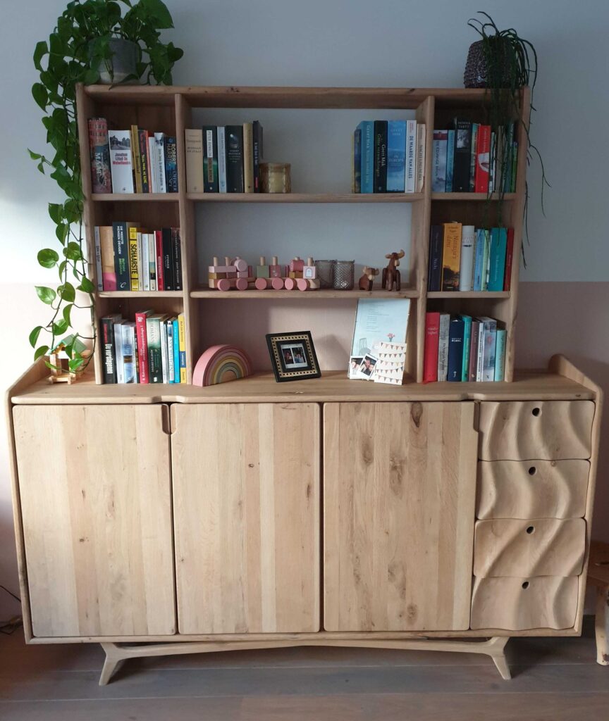 De kast is stand-alone en daarom perfect voor degenen die waarde hechten aan minimalisme in hun interieur. De kast biedt voldoende opbergruimte met verstelbare planken om al je spullen georganiseerd te houden. Tevens is er één schuin plankje aangebracht voor de schuine literatuur 😉